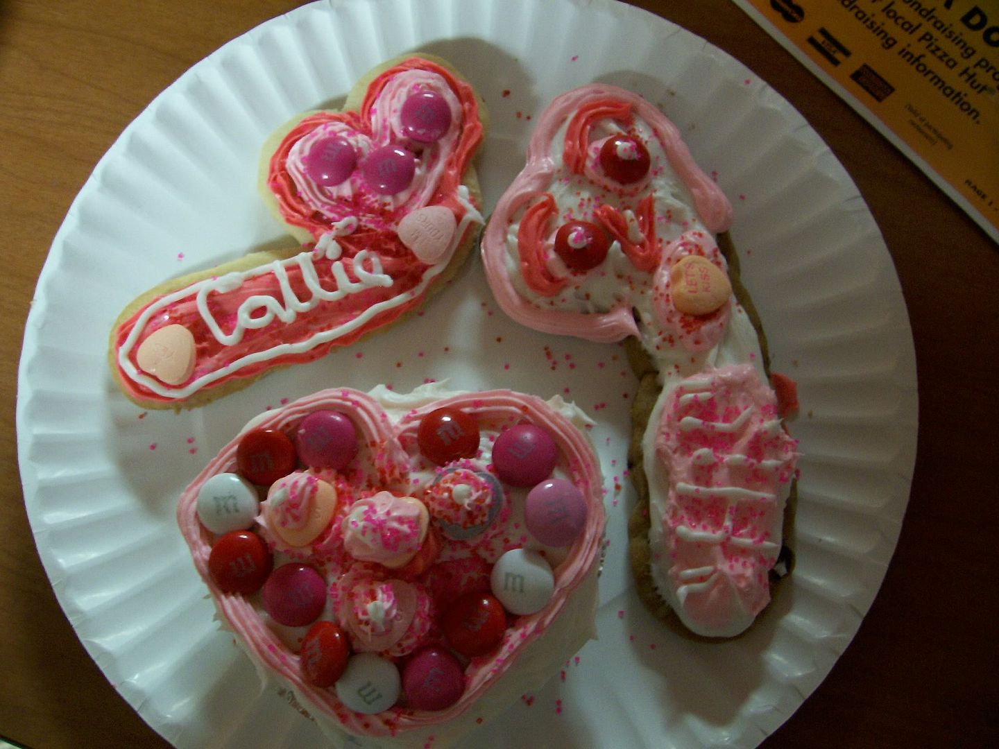 What a wonderful start to Valentine's day! Guess what I did? I decorated p**** cookies! If you want to see pictures of the ones I decorated, click here and here. If you want to see pictures of the ones Callie decorated, click here and here. Warning: there is some strong thematic content. And if you think those are bad, you probably wouldn't approve of what my RA gave us in our Valentine "goody" bags. Hint: it's not candy. Anyway, Happy Valentine's Day!